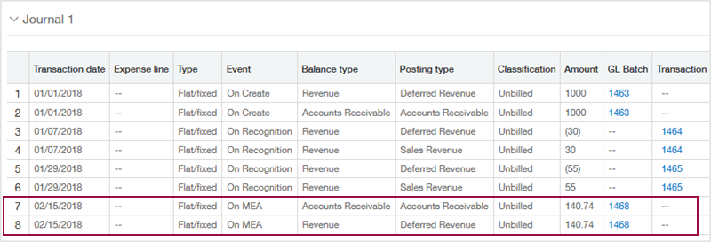 If you post revenue for usage records with usage dates that occur before the MEA allocation effective date, Intacct will create adjusting entries in either Unbilled AR and Unbilled Deferred Revenue or Billed AR and Billed Deferred Revenue, as applicable, for the difference between the flat/fixed amount and the reallocated revenue.