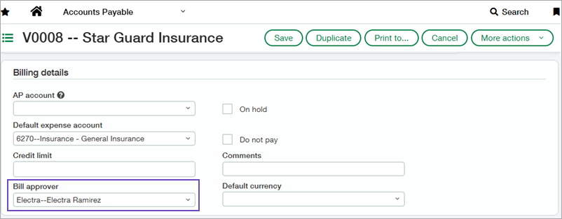 When you add the vendor-based approval rule type to your bill approval policy, you have the option to assign a bill approver to each vendor, in the vendor record. Then, when a bill is submitted, Sage Intacct routes the bill to the assigned approver's queue for review.
